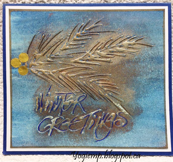 Gesso Resist - Winter Greetings I drew my pine leaves and wrote out the greeting with a mix of Liquidtex Clear Liquid Gesso mixed with Golden Matte Medium and some water in a needle tipped bottle on cheap watercolor paper. When dry Painted the background with Daniel Smith "Cobalt Blue". When dry rubbed with Art Alchemy "Vintage Gold". Punched out some circles from gold paper. Added a violet blue shadow with Prisma colored pencil.. Edged the artwork with a Kuretake gold metallic pen. Adhered to a white cardstock then onto my dark blue card base.