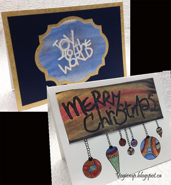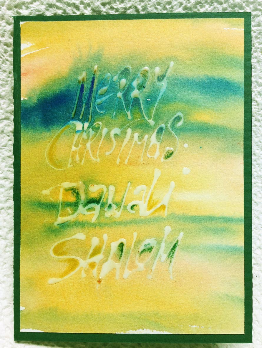 Gesso Resist - Xmas Words I drew my Xmas words with a mix of Liquidtex Clear Liquid Gesso mixed with Golden Matte Medium and some water in a needle tipped bottle on cheap watercolor paper. When dry painted the background with QoR watercolors Quinacridone Gold, and Daniel Smith Ultramarine. Accented with a green Prisma colored pencil. Adhered to a dark green card base.