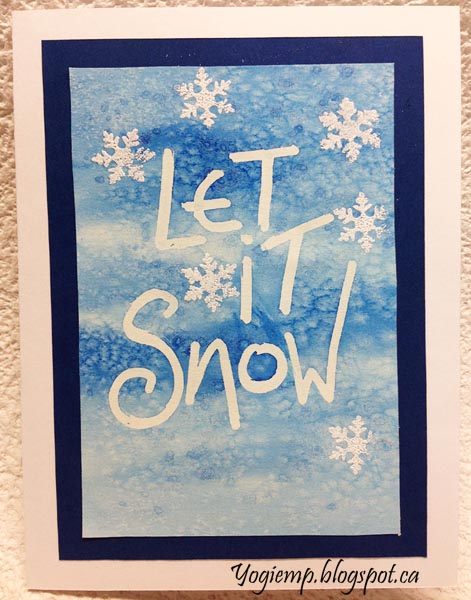 ID: Nov20 - Masking Pen Resist - Let It Snow Wrote in my words with a Molotw pen filled with Pebeo masking fluid. Painted my watercolor paper with Daniel Smith Ultramarine blue and sprinkled with coarse Sea Salt and some table salt. When dry removed the salt Rubber stamped the snowflakes with Distress pad "Picket Fence" and heat embossed with Stampmania "Glacier White" embossing powder. Adhered to a dark blue cardstock then onto my white card base. |