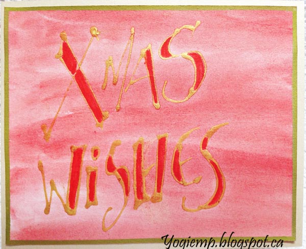 Gold Gesso Resist - Xmas Wishes I drew my words with Daniel Smith Gold Gesso mixed with water in a needle nose bottle. When dry painted the background with QoR watercolors Permanent Scarlet. Filled in the letters with Poppy Red Derwent Inktese watercolor pencils. Edged the artwork with a Kuretake gold metallic pen. Adhered to an off white/gold pearlized card base.