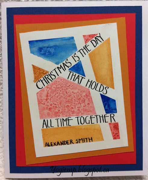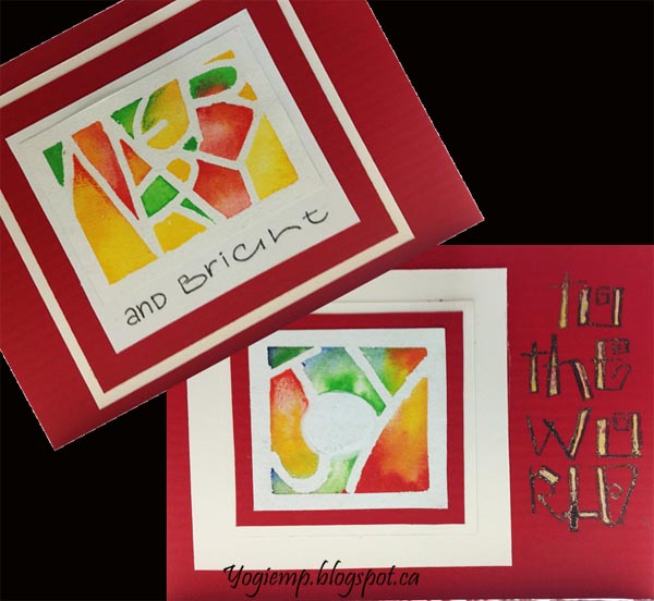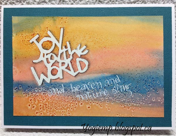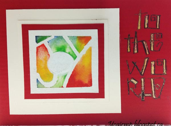 Stencil Mask Salt Resist - Joy To The World This is my favorite piece I created in the 3 days... I love the colors and the way the salt reacted. I cut my stencil from Tim's Masking stencil. It didn't stick so well, so I applied masking fluid to the back. Painted the background with QoR watercolors Quinacridone Gold and Permanent Scarlet and Daniel Smith Ultramarine.. Sprinkled table salt. When dry removed the masking and shadowed with a 5B pencil and paper stump. Wrote in the rest of the words with a pointed pen in my funky curly lettering style and Bleed Proof ink. Adhered to a greenish blue textured cardstock and then onto my top folded white card base.