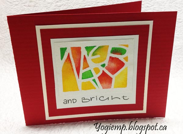 Resist Pen - Merry & Bright I masked out a rectangular area, wrote out my word using a Molotow pen I filled with Pebeo masking fluid. When dry painted with Winsor and Newton watercolors, wet on wet. When dry removed the masking tape and added Prisma colored pencil accents in the corners of the letters. Adhered to another piece of the Text Wove paper and Inked in the words "and Bright" with a black Zig Writer. Adhered to a red textured cardstock, then a white pearlized cardstock, then to the main red side folded card.