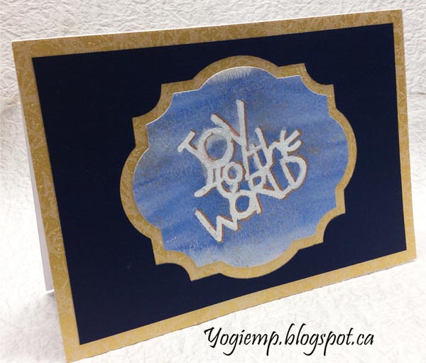 Joy To The World Ct out a stencil from Tim Holtz "Make Your Own Stencils" sheets. Didn't want to adhere to my Arches Text Wove paper, so covered the stencil with Masking fluid and stuck it to my paper.... (where there's a will there's a way). Washed over with the Art Quest in "Quasar Blue" and sprinkled Schminke gold powder. Die cut the text with the smaller frame die (Sue Wilson "Festive Collection - Holiday Lattice Frame" set) and the blue background (back side of a DreamWeaver stencil packaging) with the larger frame die. Adhered to a gold patterned wrapping paper (Paper Roots) and then onto my white card. |