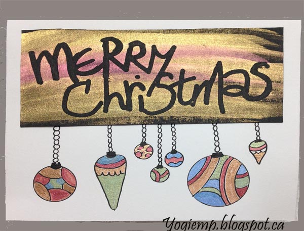 ID: Resist - Merry Christmas I filled a Molotow pen (3.5mm felt tip) with Pebeo masking fluid and wrote "Merry Chrstmas" on Black Recollections cardstock. When dry painted washes of watercolors (ArtQuest Mica Color "Metallic") in "Super Russet" and ""Super Bronze". Dried and removed the masking. Trimmed down and adhered to my white Staples 110# cardstock. Drew in the ornaments with a black Zig Writer and colored with the same Art Quest paints. |