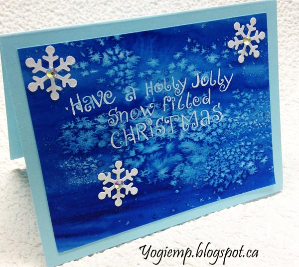 Snowflakes - Have a Holly Jolly Painted my watercolor paper with Daniel Smith Ultramarine blue and sprinkled with coarse Sea Salt and some table salt. When dry removed the salt and wrote in my text with a pointed nib in my curly style lettering. Punched out some snowflakes (Quietfire Design - Elizabeth Craft Designs) from white pearlized cardstock and adhered to card. Adhered everything to a mid blue toned card base. Adhered some AB nail art rhinestones. |