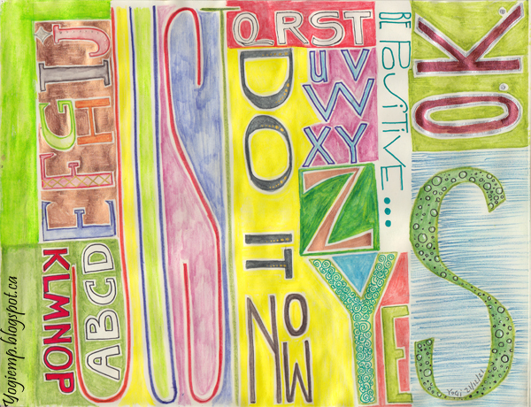 Day 3: Just Do It Words I live by... On Genoa Bond paper, drew in all my words then outlined and colored with various medias and tools. Derwent Inktense pencils, Micron pen, gel pen, Artistro extra fine tip pens, Finetec paints, #1 paintbrush.