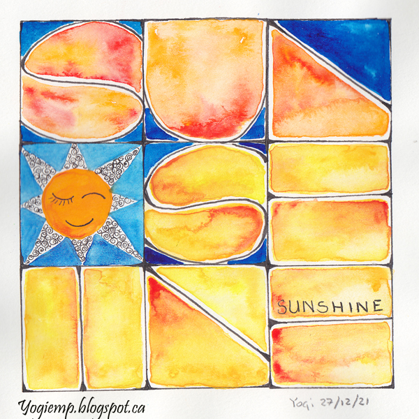 Day 4: Sunshine On Bee Super Deluxe paper drew my 1.5" squares with a Zig Writer. Painted with QoR watercolors in yellow and dropping in some red. |