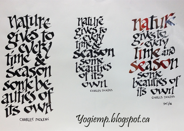 ID: Nature Gives to Every Time I started with a 6.0 Parallel Pen and Sumi ink, then did the next sample with a 2.4 and 3.8 interspersed with a 6.0 Parallel Pen and the Sumi ink. Final piece with a 3.8 and 6.0 Parallel Pen, Sumi ink and a dirty empty parallel pen dipped into Ecoline inks. Text: Nature Gives to every time and season some beauties of its own. Charles Dickens