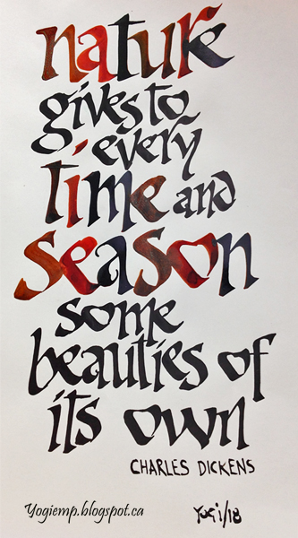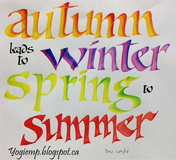ID: Autumn Leads To Winter 2.4 Parallel pen and Sumi ink on white calligraphy practice paper. The seasons done with the Windsor Newton watercolors, double dipping in various colors symbolizing the season. Text: Autumn leads to Winter Spring to Summer