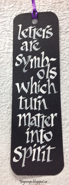 ID: Bookmark 3.8 Parallel Pen and Copic Opaque white ink mixed with water on black cardstock. Text: Letters are symbols which turn matter into spirit.