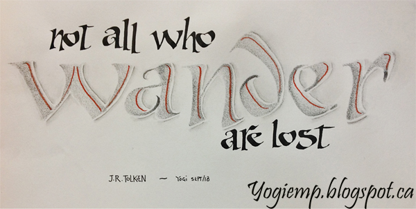 Wander The smaller lettering done with a 3.8 Parallel Pen and Sumi ink on white calligraphy practice paper.. "Wander" done with Graphite pencil chiseled to a flat edge, detailed with a red pencil, shadow outlined with a 6B pencil and paper stump then a flat edge eraser cleaned out the space between. Quote: not all those who wander are lost. JR Tolkien |