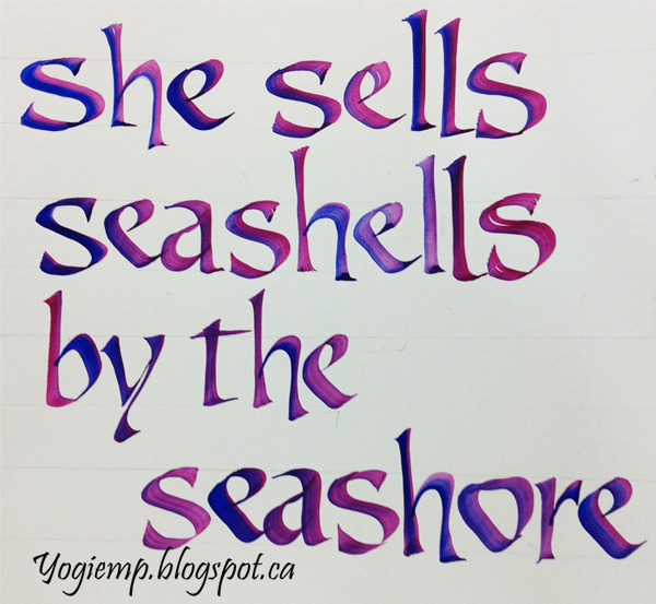 Seashells I used a flat edge brush and Windsor Newton watercolors double dipping my brush, first by fully loading with the pink tone and then on the edge into the blue on white calligraphy cardstock. Quote: She Sells Seashells By The Seashore |