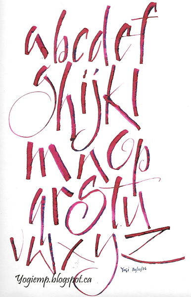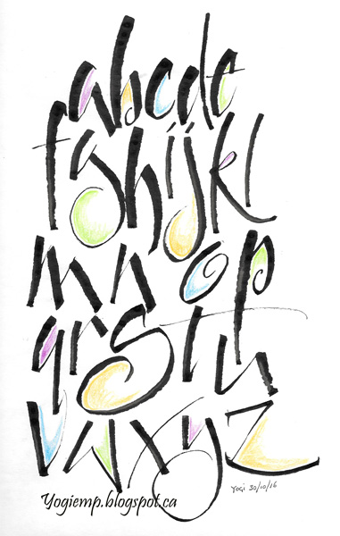 November 3, 2016 all lettering done with a folded pen. All the lettering on white paper is done on an unknown/unmarked brand, that has a really nice weight and works well with calligraphy. |
