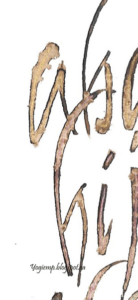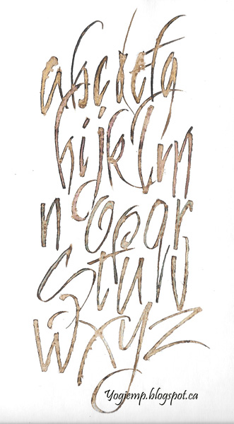 Exemplar I love the effect of wet walnut inked letters blotted up with a paper towel. It leaves such a nice textured look to the letters... You can't see it in the exemplar, but if you look closely at the detail pic below you can see a gold stroke in the first line of letters and a pink stroke in the next line... I added a brush stroke line in the thick strokes using StarQuest Mica Colors Interference palette.