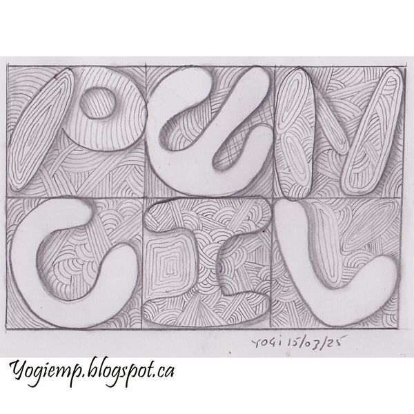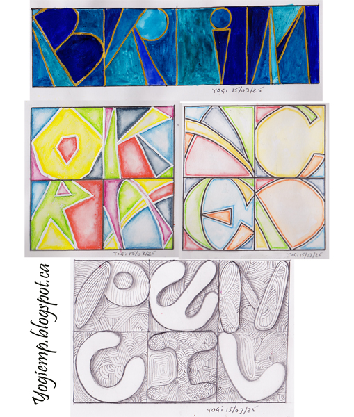 I'm taking a 2 day class with Lorraine Douglas (a BVCG Guild Member from BC) creating art with letters. On Canson Pen & ink paper. 1st image: The middle 2: OKRA, ACED - the one on the left with Derwent