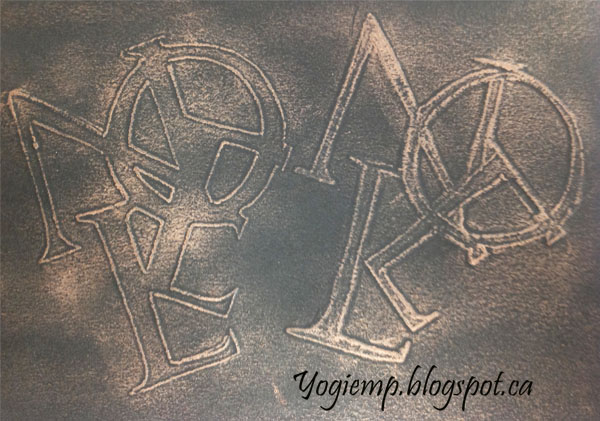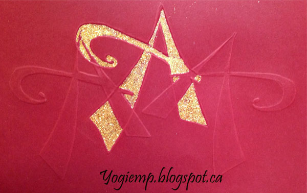 ID: "A's" In between practicing we did some dry embossing using both the negative and positive of the cut out designs. Needless to say I didn't use a Roman letter... We created a cardboard cut out and adhered the positive pieces to a piece of tracing paper and did the same with the negative pieces. (that held the pieces all together...). After dry embossing I filled the outline shape with Quickie Glue and sprinkled with Stickles dry glitter "Diamond". |