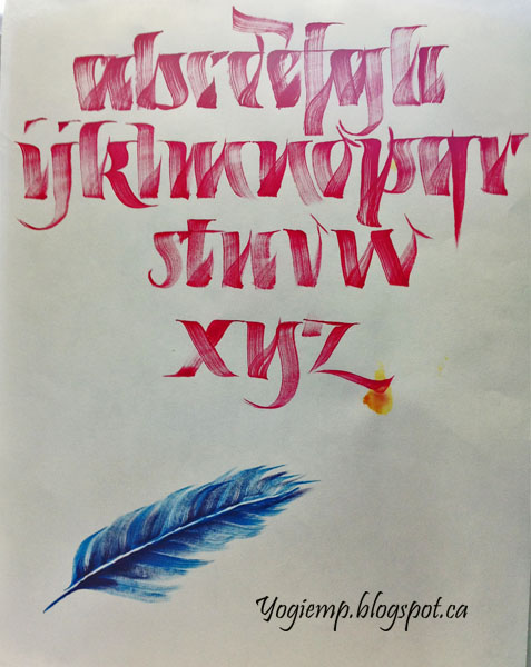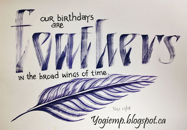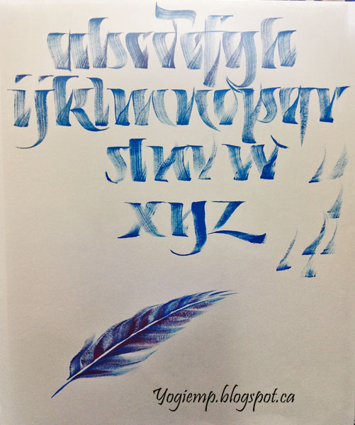 ID: "Feathers - Our Birthdays" I decided to bring in some Oriental paper and did some Flame Script lettering on the smooth side using the Holbein "Peacock Blue" gouache. I wrote in the quote using a Zig Writer. I had started with Sumi Ink in my Parallel pen, but it started to bleed immediately (which I erased in photo editing...) Loredana also showed us how to create a feather with dry brushing. |