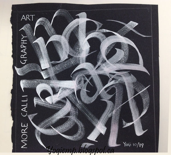 ID: "More Calligraphy Art" After practicing most of the day with the Romans, I was in a need to change my perspective. I'm really like the dry brush effect we were getting in our Romans so thought I'd create a piece with the technique but using a lettering style I liked better. I used FW acrylic ink, writing letters one on top of the other to spell out "More Calligraphy Art" on Arches Black Cover |