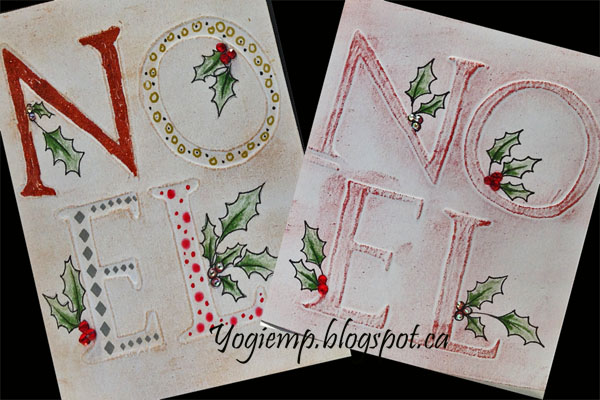 ID: "Noel 1 & 2" At the same time I cut out the above piece I also cut out the individual letters and used them in class to create these 2 card fronts. On the first one I added glitter and doodling in the dry embossed outlined letters. On the 2nd one I hit the high points with the Rub On Metallics. On both I added holly leaves and colored with Derwent inktense watercolor pencils. |