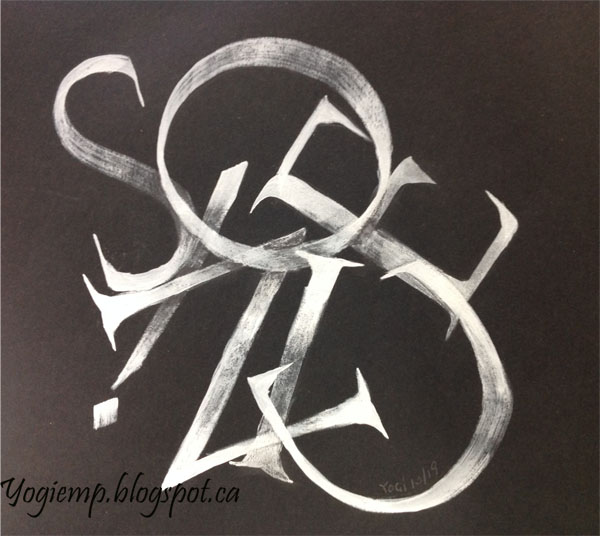 ID: "So Nice" Final exercise on day 4 was to create a multi layered Brush lettered piece using Romans. Of course I didn't catch all the instructions... and only layered multi letters on a single plain. So to make things stand out more, penciled in shading to create multiple layers. I used Holbein "Permanent White" on Stonehenge Aqua Black paper. The letters spell "So Nice" What we were supposed to do was do a first layer in a very light color or tone and having no letters overlapping. The 2nd layer with a slightly darker color or tone again with no overlaying letters but overlaying letters over the 1st layer. The 3rd layer uses the darkest color or tone no overlying letters but overlaying on the 1st and 2nd layer. I know sounds a little confusing but looks gorgeous on Loredana's piece.