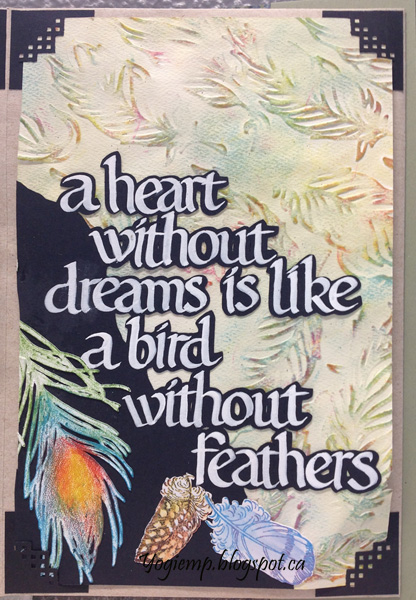 ID: Feathers - A Heart Without Dreams I dry embossed the background with a feather embossing folder (Elizabeth Craft Designs "Feathers"). Hit the high points with various Distress pads and sponges. I created quote piece a while back when I was taking a Foundational calligraphy class. I had done the calligraphy, scanned it, added some details in my photo editing software, then imported it into my electronic cutting software and cut from black cardstock. Re-wrote the lettering with a Parallel pen 3.5mm and white ink (Copic Opaque mixed with water). Adhered to embossed background. Electronically cut some feathers, stamped and colored them (the peacock feather - Local King Rubber "Feather Pleasure"; the small feathers Stampendous "Feathers") Quote: a heart without dreams is like a bird without feathers. |