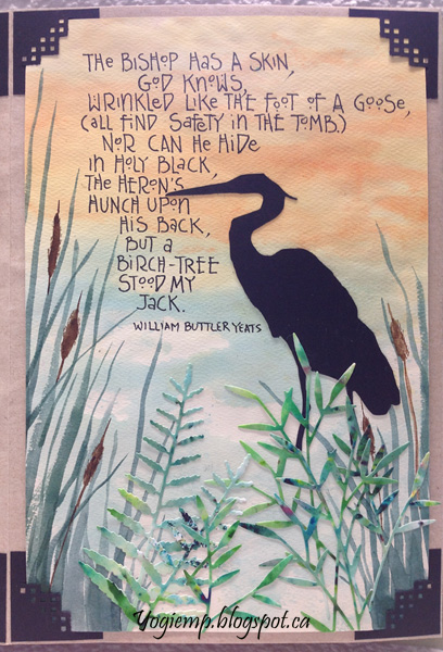 ID: Heron - The Bishop Has a Skin I watercolored the background and when dry, painted the bulrushes. Found a silhouette image of a heron and electroically cut from black cardstock. Adhered to page and then adhered various grasses and ferns from my stash. Lettering done with a Zig Writer in "Renee Mackintosh" lettering style. Quote: The Bishop has a skin God knows, wrinkled like the foot of a goose, (all find safety in the tombs) nor can he hide in holy black, the heron's hunch upon his back, but a birch tree stood my Jack. William Buttler Yeats. |