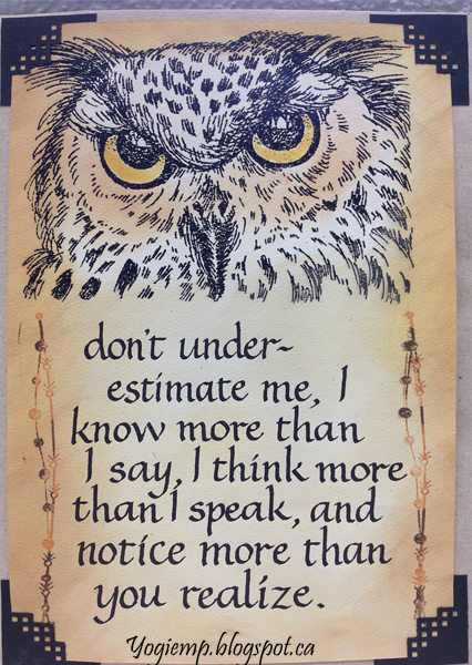ID: Owl - Don't Underestimate Me I love this owl image Stampendous "Look Into My Eyes") stamped with Versafine Black Onyx and clear embossed, then accented with watercolors. Background sponged with Distress browns. Borders stamped (Carabelle Studio "Dance Avec les Plumes") Calligraphy done with a Parallel Pen 1.5mm and Sumi ink. in a Foundational hand. Quote: Don't underestimate me, I know more than I say, I think more than I speak, and notice more than you realize. |
