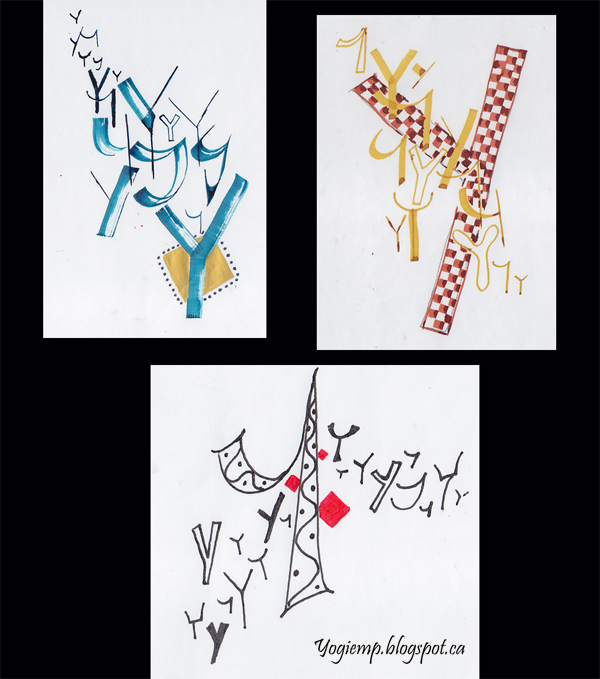 The first exercise was to choose a letter and create a composition... On Canson Pro Marker paper. Upper left image with a 6.0 Parallel pen and Ecoline Turquoise ink. Gold gel pen square. Upper right image with Faber Castell Pitt Calligraohy pens - green gold and Sanguine Lower image with a Uniball gel pen and red Zig Writer. |