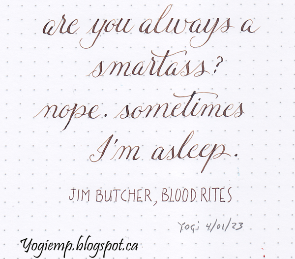 2023 Edmonton Calligraphy Society is hosting Mike Kecseg for a 2 day class to try to teach us Pointed Pen... This is my 2nd class with Mike and hopefully something of what he's teaching will sink in... I'm working in my Rodia Dot Pad using a Nikko G nib and walnut ink.