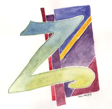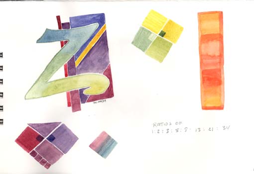 Again I was playing with the "Z"' There was a sample in Adolf's book where he starts with one color and blends along and ends with another. Really nice transition. Mine turned out ok, although the letter form could be improved a great deal. Then there were a few more variations of those interesting squares. Peter also talked a little about the ratios of things, like the distance between your upper lip and your nose, or your lower lip and your chin and it all has to do with this ratio: 1:2:3:5:8:13:21:34 etc |