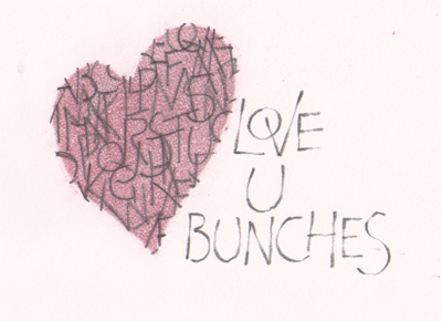 Love this technique and the result it gives and who would have thought it was this easy... The exercise was basically shown using a square template cut from a piece of paper, letters randomly written and over lapped within the square, making sure they came off the edge onto the template. Then some graphite was smudged over the square, template removed and you had a great focal point. I decided to cut out a heart instead and colored it with some pin chalks. Then wrote the rest of my piece in the Pressure Release style. |