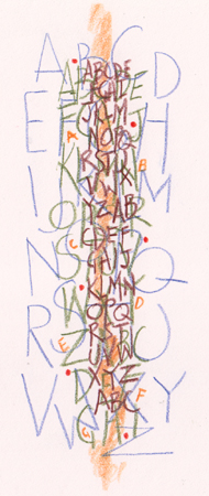 I've never done this technique although I've seen it a lot. It works a piece from light to dense. The further spaced the letters are, the lighter the piece will be. The closer the letters are, the denser the look. So we started out with writing our letters far apart. Then the next layer was a bit closer, and the third layer was closer still. I did the 3 layers Blue, green and then burgundy. I then added the orange colored pencil down through some of the letters. I then added some very small letters in orange and finally added some red dots. Some of the samples were glorious with walnut ink running through the letters. |