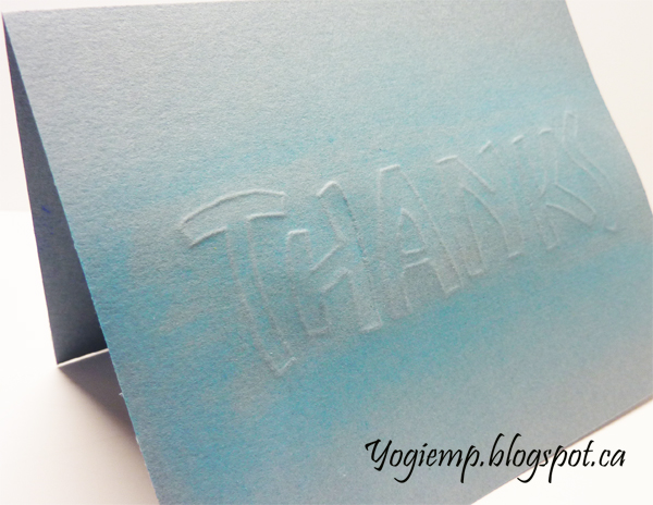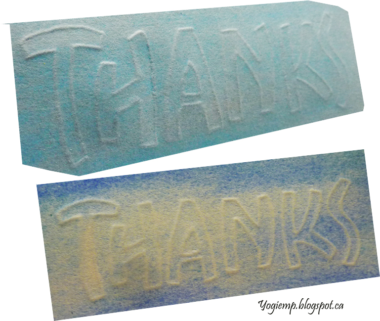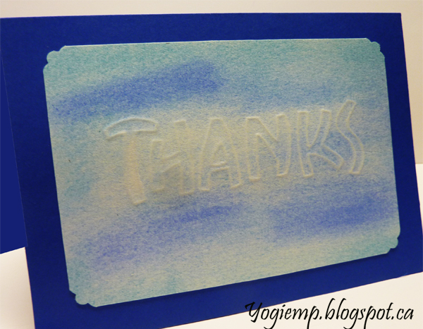 I find dry embossing very hard to get the results I want... it never comes out as pronounced as I would like. I'll keep trying. I guess I should try on art paper instead of regular cardstock... Created my embossing template from regular cardstock. adhered a piece of thin paper like tracing paper to the good side, adhering drop out pieces like in the "A" and gluing down the pointy contours to prevent them from deteriorating while embossing. On blue Recollections cardstock embossed the word "thanks" then using a cotton ball applied Pan Pastels all over. Rubbed a clean cotton ball to remove the pastels from the high points then adhered to a card base.