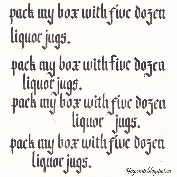 2022 I'm taking a ZOOM Blackletter class through the Lettering Arts Guild of Red Deer with Tamer Ghoneim. I didn't do last week's homework... This week we finished the Minuscule and started on a few of the Majuscules. Our homework this week was to write out a pangram 5 times. I have a very very hard time repeating things. I get bored very quickly and loose focus... Just look at my last line and the "q" in "liquor"... that's a real drunken "q"... So I stopped writing after 4 repeats, even with letter variations in each line. sigh!! I used a 3.8 parallel pen and Sumi ink on Genoa bond calligraphy paper. My pen was too generous with the flow of ink (I probably watered it down too much...)
