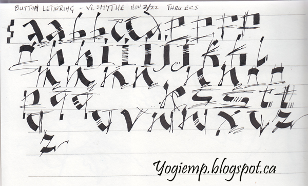 2022 I took another ZOOM class hosted by Edmonton Calligraphy Society with Violet Smythe creating a fun Button Alphabet. Not sure why it's called that... In my Bee Super Deluxe journal drew the letters using a 4.5 Parallel pen and Sumi ink. (4 pen widths high). It's really funky. Some of the letters I don't really like so I will alter them...