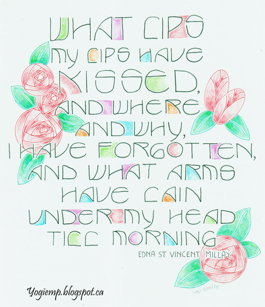 Millay - What Lips On Canson Pro Layout marker paper using a Zig Writer in Art Nouveau style lettering. Drew in the Deco roses with Juice Up pens and colored with Posca colored pencils. words: What lips my lips have kissed, and where and why I have forgotten, and what arms have lain under my head till morning. Edna St Vincent Millay