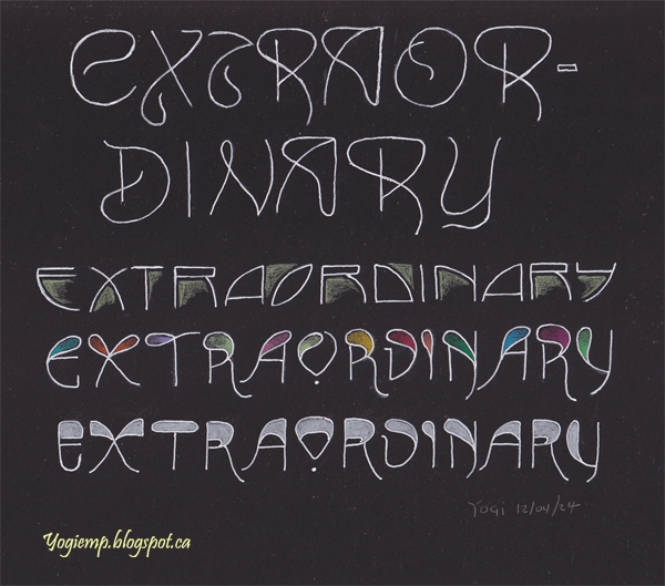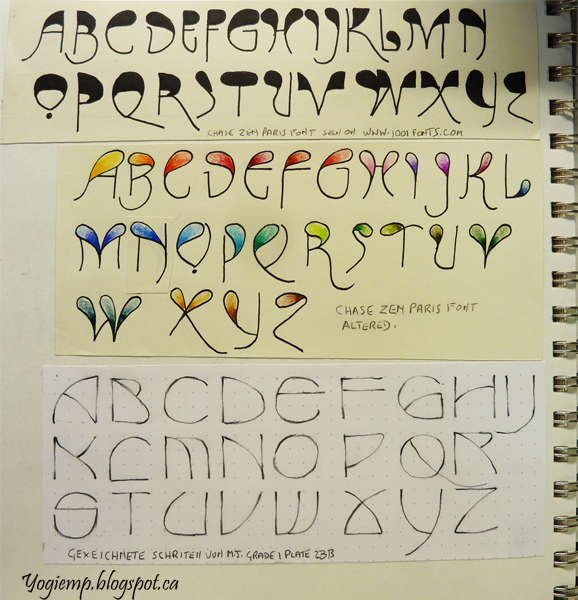 ID: Art Nouveau - Extraordinary On Strathmore black Artagain wrote out the 3 Art Nouveau lettering styles we learnt on April 11th as out homework for next week. I used a white Gelly Roll 08 pen. Colored the counter and or inner spaces with Black Addition colored pencils. The top one I kept plain, the next with an olivey/apple green. The third one is my take on Chase Zen Paris Font and colored with a different color in each bulbous area. The last one which is the actual look of the Chase font with only white. |