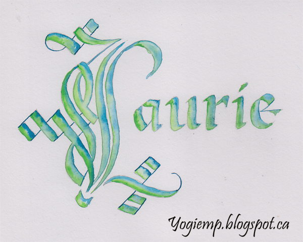 On Canson Mixed Media paper penciled my word then painted (using 3 brushes in my hand) with watercolors wetting a section and painting one edge with Peacock Blue and the other edge with Permanent Green #1 (both Holbien). Let dry then with a pointed nib and the blue added the thin lines |