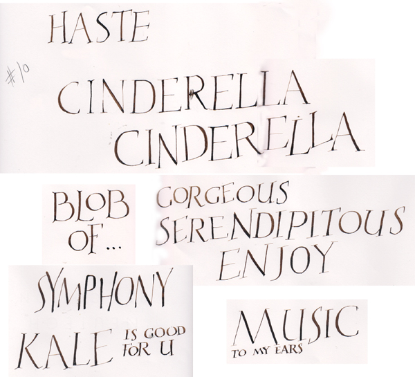 #8: Now we're working on creating the thicks and thins to add contrast. #9: Then we were told to use the word "Weight" and start from very light pressure to very heavy. Then adding the word "less" and work from the heavy to the light. Under that is just a practice piece. |