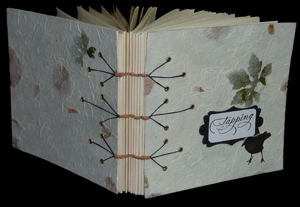 The book block is attached to the legs of the raven with a running stitch and a wrapping technique. The booklet in this sample is a close sample to what you will make. I used LBS end sheets from Columbia Mills. My journal has 9 signatures of 4 folios (total 36 pages per signature). Page size is 6"w x 6"h. The covers are mat board covered with heavy mulberry paper. The legs & feet are 4ply waxed linen thread. |