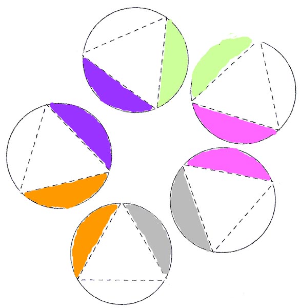 For the more involved ornament you will need 20 circles, Follow instructions as above for 10 of those circles. With the other 10 you will adhere in this configuration below