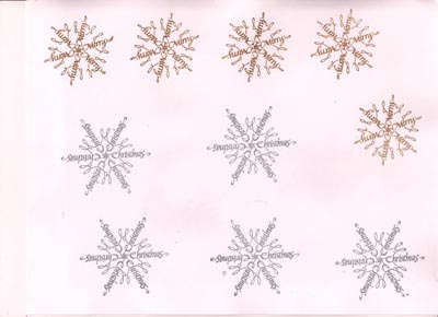 Created: December 13, 2012 The ornaments on the left are created from 10 die cut or punched circles... a very easy project. The one at the bottom is done with 20 circles and a bit more involved. The ornament on the far left had the abstract background made first on some glossy paper using various Xmas stamp sentiments and quotes, just filling up the background, spraying with Dylusions sprays and some water and drying, then die cut with a Spellbinders circle die. The ornament on the right had the snowflake words stamped and embossed in gold or silver on white 67# cardstock, with plenty of space between the stamping to then die cut with the circle die - see image below - Dia "A". All the stamps used are from Quietfire Design. Scoring template HERE |