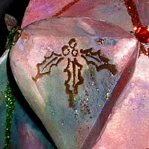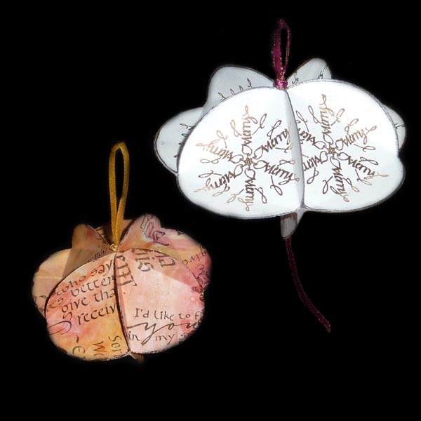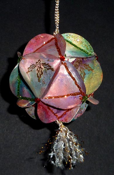 After die cutting, each circle was scored using a clear plastic stencil (see scoring template link above) and then folded on the score line. When all were scored, the flaps were adhered to each other. Do 5 circles to create the top first. Then the next 5 to do the bottom section, then adhere the two sections together. Apply some glue (glue stick or some white glue) on ONE flap only (on the undecorated side). Adhere to a flap on the next circle. On this circle apply glue to a flap and adhere to the third circle. Continue to fifth circle, then adhere the fifth circle flap to the first circle flap. See Dia "B" Repeat for the bottom section. At this point you can attach a string or ribbon and adhere to the inside of the top part of your ornament. Or you can wait to finish the ornament and punch a hole in one of the flaps and tie your ribbon. Adhere the two sections together, by gluing one flap from the top to the bottom, then the next one and so on till all have been glued together.