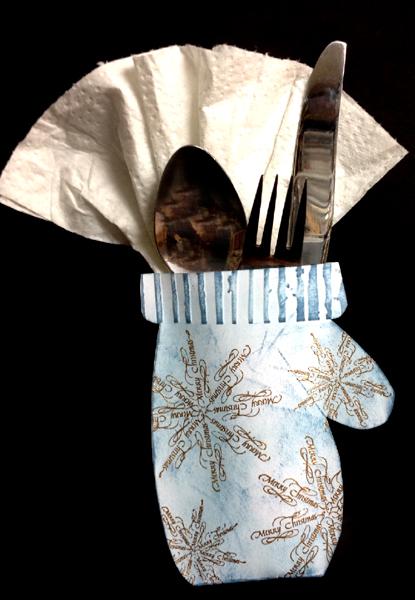 Fold a piece of white cardstock (11h" x at least 6"w) in half to get a size 5.5"h x 6'w. Place cutting template on top so that the bottom of the mitten lies along the fold line. Pencil in your mitten shape and cut out both layers at the same time. Place the embossing folder (Cuttlebug "Distressed Stripes") so that the edge is in line with the lower edge of the mitten cuff - emboss. PS you can use any linear type embossing folder to mimic the knitting detail. Ink the small and large "Snowflake Merry Xmas" stamps with Versafine Toffee and repeatedly stamp to cover the mitten, emboss with Queen's Gold embossing powder. Sponge with Distress "Tumbled Glass" then hit the high points and randomly over the mitten, direct to paper, with Stormy Sky. Put a small bead of glue right on the edge on the inside of the mitten and adhere both sides together to create the pocket. Fold napkin decoratively and insert with cutlery. Enjoy.