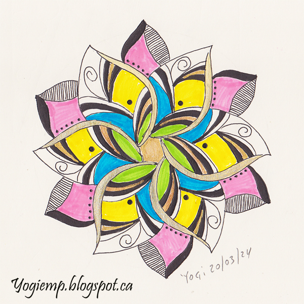 Created: March 21, 2024 Something similar came on my Pinterest feed and I was in a doodling mood... My doodles are a little bit different and I colored mine... On Genoa Bond calligraphy paper divided my large circle with 6 equidistant points and created the inner petal design. Doodled and then colored with Koi Calligraphy Brush Pens, adding a touch of gold with a Posca gold metallic .7mm bullet shaped pen. Then added the outer petals. Doodled with a Juice Up pen and a Zig Writer.