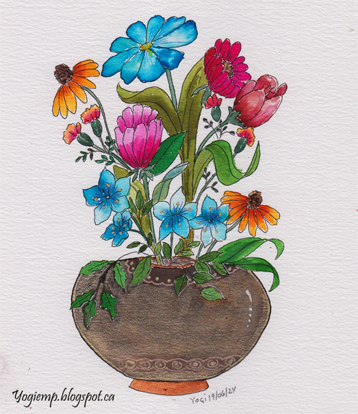 Created: June 16, 2024 I was doodling flowers - just whatever popped into my head and liking what I was doing so added leaves and a vase. On Genoa Bond paper and using Posca colored pencils and a Lyra Splender Blender. Beats me what they're all called or even if they're the right colors...