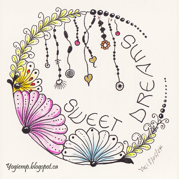 Created: May 9, 2024 Again something I saw in my Pinterest feed... On Genoa Bond Calligraphy paper using a Zig Writer and a Juice up pen created my circle/border/dangly elements. Colored with Posca colored pencils. words: Sweet Dreams