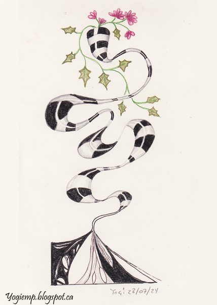 Created: July 29, 2024 Looking at my Pinterest feed and saw something by Helen Williams again... Loved the look of the zig zag doodle with that shine to it... When done I decided to add the leaves and flowers coming out of what I think looked like a vase... On Genoa bond calligraphy paper, using Posca colored pencils and a Juice Up pen.