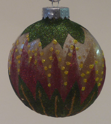 I masked of the top area and sprayed Krylon Easy Tac on the bottom area (1 side at a time) and applied Red Variegated gold leaf, pressed down lightly to make good contact and allowed it to dry for several hours before brushing off the excess and buffing it up with a silk cloth. I followed the veining with a Squeeze and Roll glue pen (has slightly more glue coming out than a Quickie glue pen), sprinkled with red glitter and allowed to dry before doing the other side. Brushed Tresser's gold size in the open areas, one space at a time, and sprinkled with glitter (Stardust, Dark Gold or Orange). Allowed them to dry thoroughly, brushed off excess glitter, then wrote in my word "Joy" with a black Sakura Identi Pen. |
