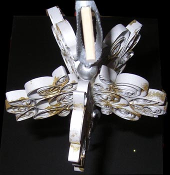 | I recently made an paper xmas ornament for a Byhand Challenge and I had made it in the shape of a 3D snowflake. I was looking at it and said to myself, why not try making it out of quilled pieces. I really like the way it turned out and it's quite sturdy. I had thought it would be more fragile, but I reinforced sections and the central core where the ribbon runs through is made up of several solid coils glued together. I used 1/4" w silver metallic quilling strips. Made each section and then glued them together. I waited 12 hours to make sure everything was dry before putting a very liquefied glue over the edges using a very soft brush and then sprinkling with Ritz Glitz glitter "Dark Gold" I added a couple of wood beads that I painted silver with a Krylon leafing pen and a couple hand made paper beads made from some marbled paper I had made a while back. |